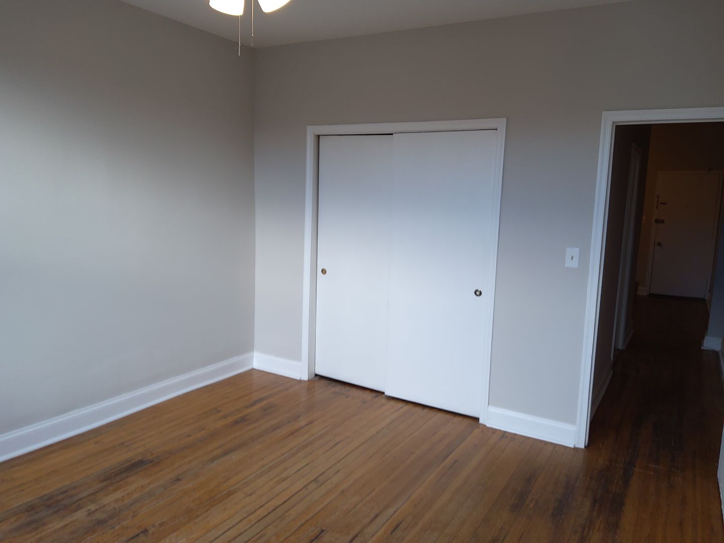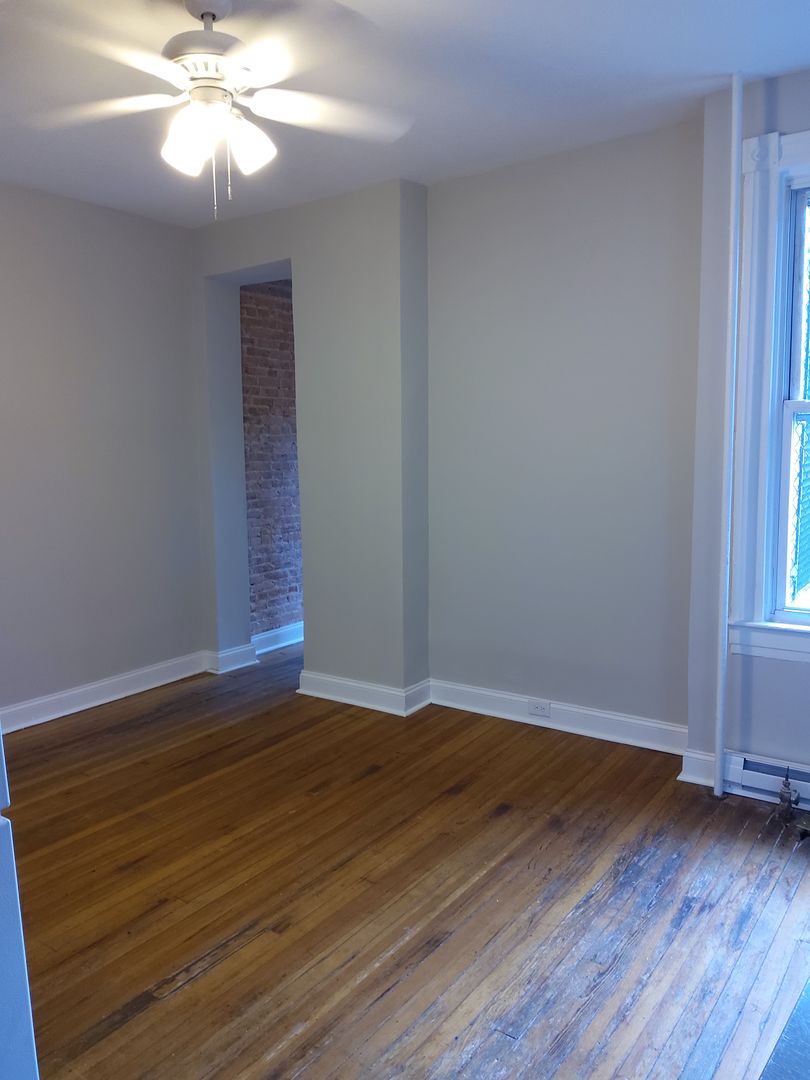 Large second level One Bedroom Apartment being offered. This newly remodeled unit offers newly refinished pine flooring thru out. Enter in the main living space with high celingins and new ceiling fan, galley kitchen is just off main space and has electric range and full size refrigerator. Down the hallway with exposed brick you will find a full bath with all new ceramic tiling, new large vanity and kohler wall cabinet with mirrors inside and out. The bedroom is spaious and has a full wall to wall closet . There is lots of storage space in this unit. New replacement windows allow lots of natural light into this space. Great western exposure in the bedroom. Pets are welcomed with owner approval.
